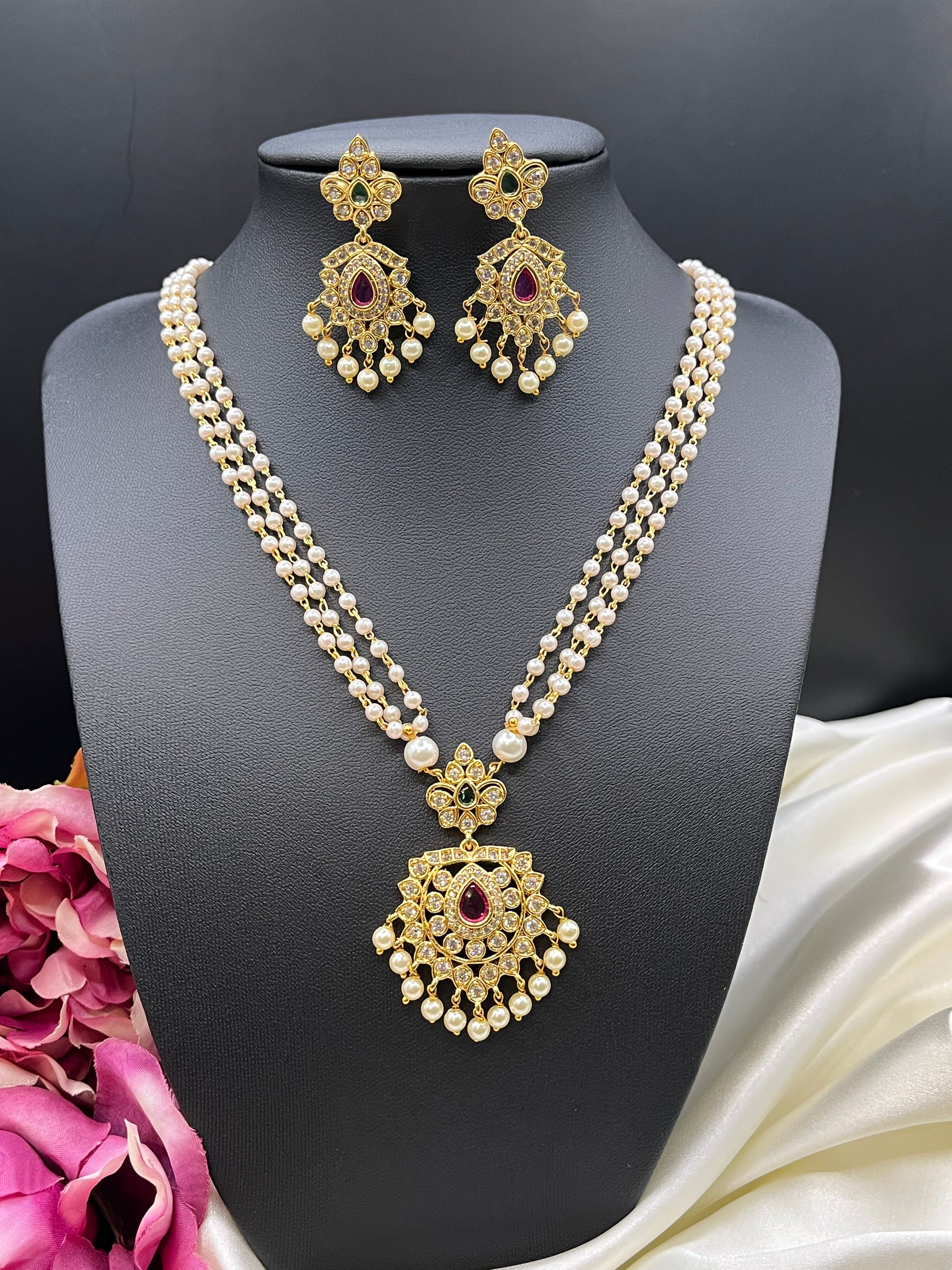 Add a touch of regal charm with this stunning 3 layer gold plated necklace set, crafted with high quality faux pearls and a ruby stone-studded pendant. Paired with matching chandelier-style earrings, this elegant Indian bridal jewelry set is perfect for weddings, parties, and festive occasions. Designed to showcase timeless tradition with modern craftsmanship.
