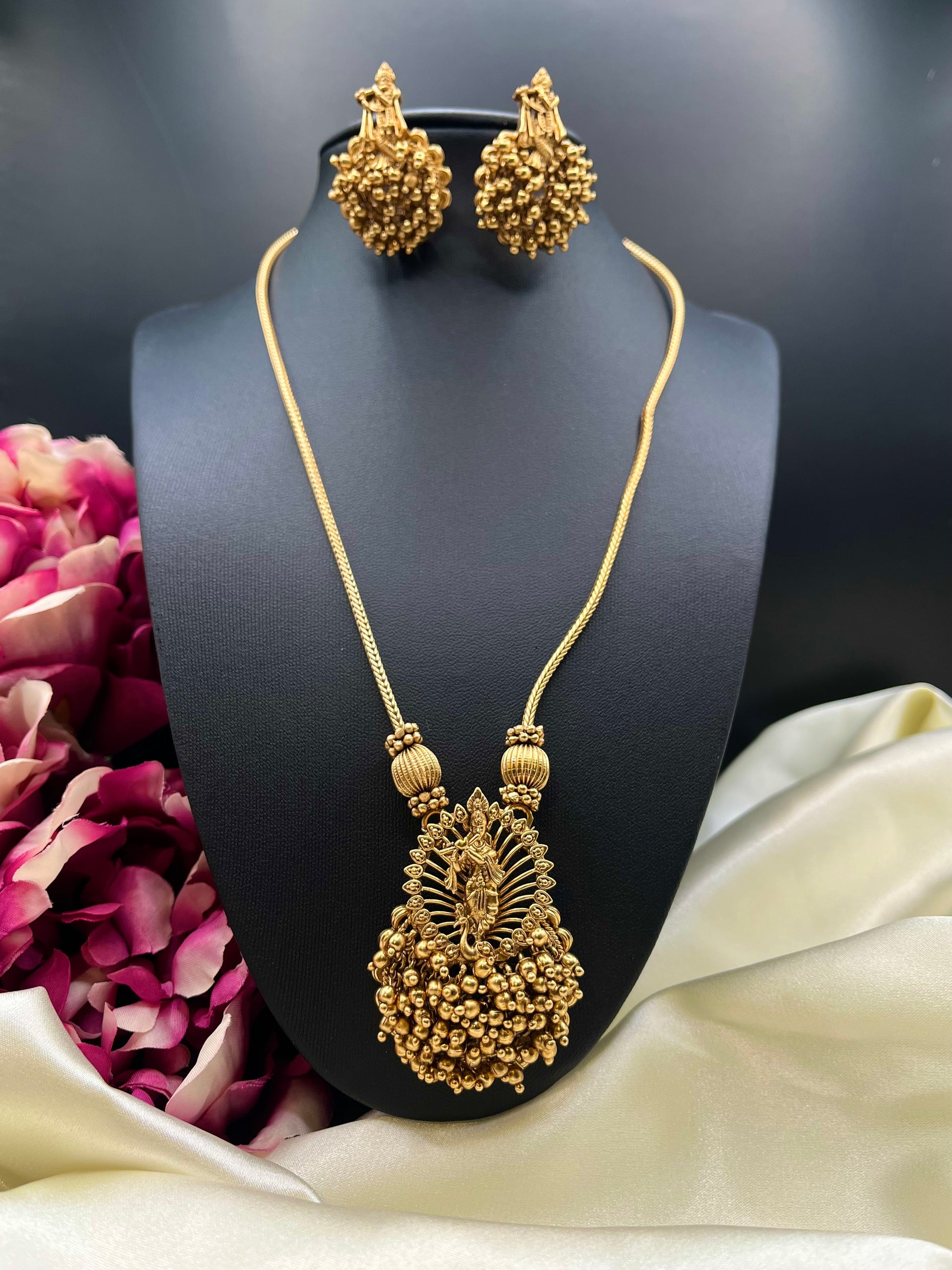 Elevate your look with this short haaram style Krishna necklace set, featuring intricate gold-tone detailing and delicate cluster bead work. The set includes matching earrings and comes with adjustable clasps at the back for a comfortable fit.